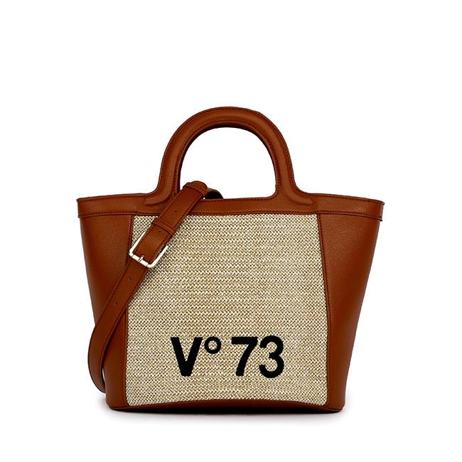 Bolso capilla grande en paja y símil piel. Detalle de asa redondeada, logo V73 bordado.