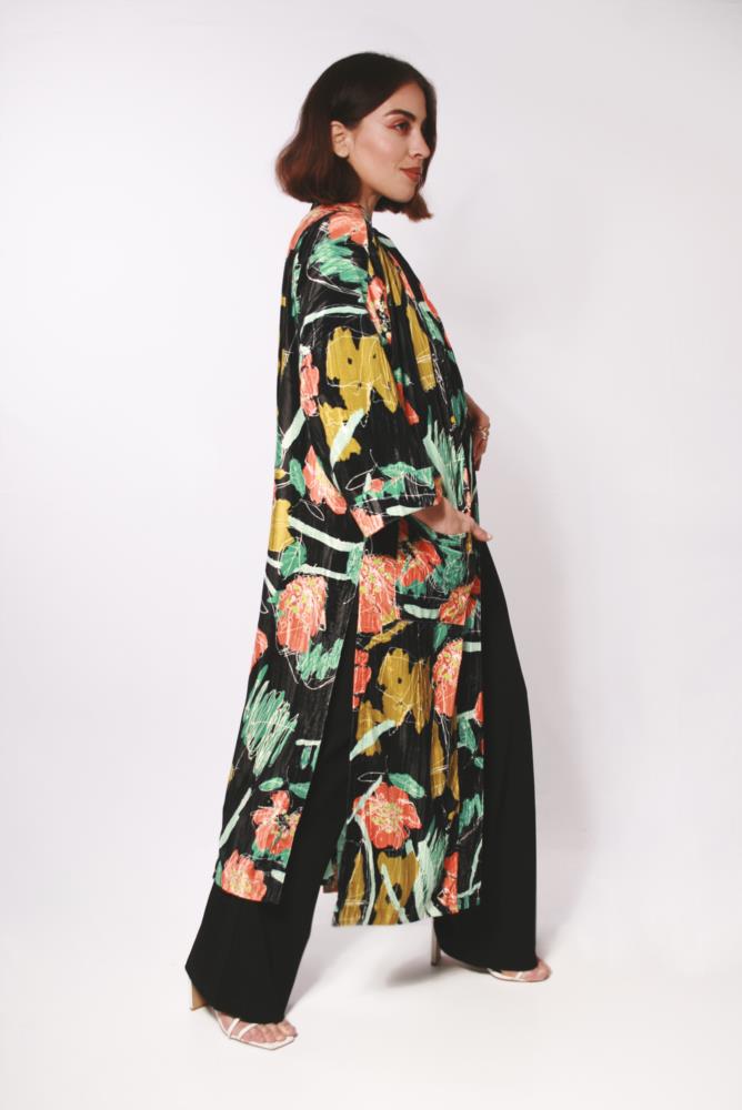 Kimono largo en terciopelo forrado por dentro en tono turquesa