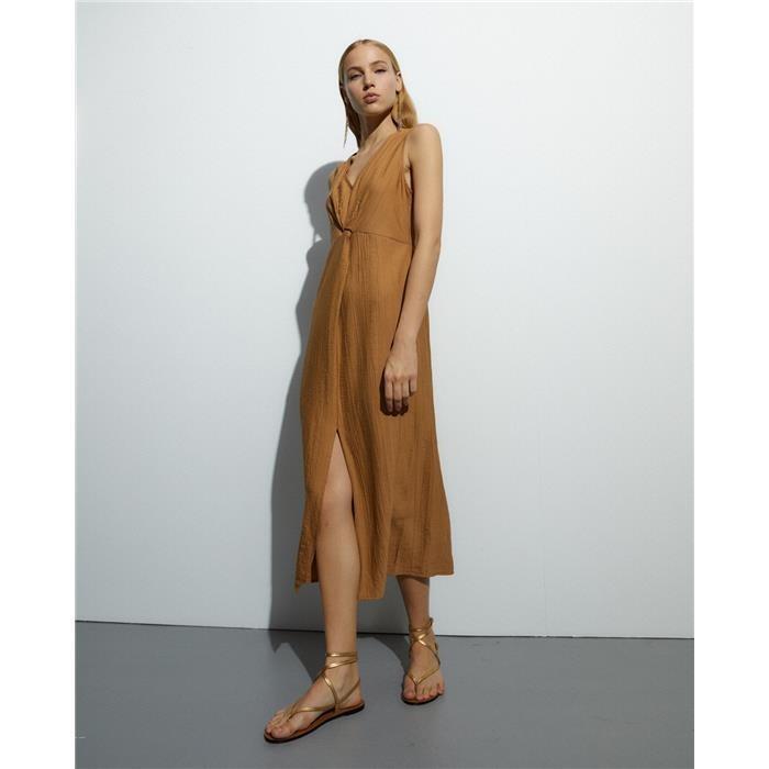 Su tono tierra lo convierte en una pieza muy versátil y fácil de combinar, perfecta tanto para looks relajados con sandalias planas como para ocasiones más especiales con calzado más arreglado.