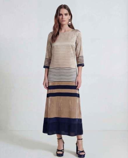 Confeccionado en un tejido ligero y con caída fluida, presenta un diseño de rayas horizontales que juegan con diferentes grosores y bloques de color en tonos beige y azul marino, creando un efecto visual estilizador y muy favorecedor.